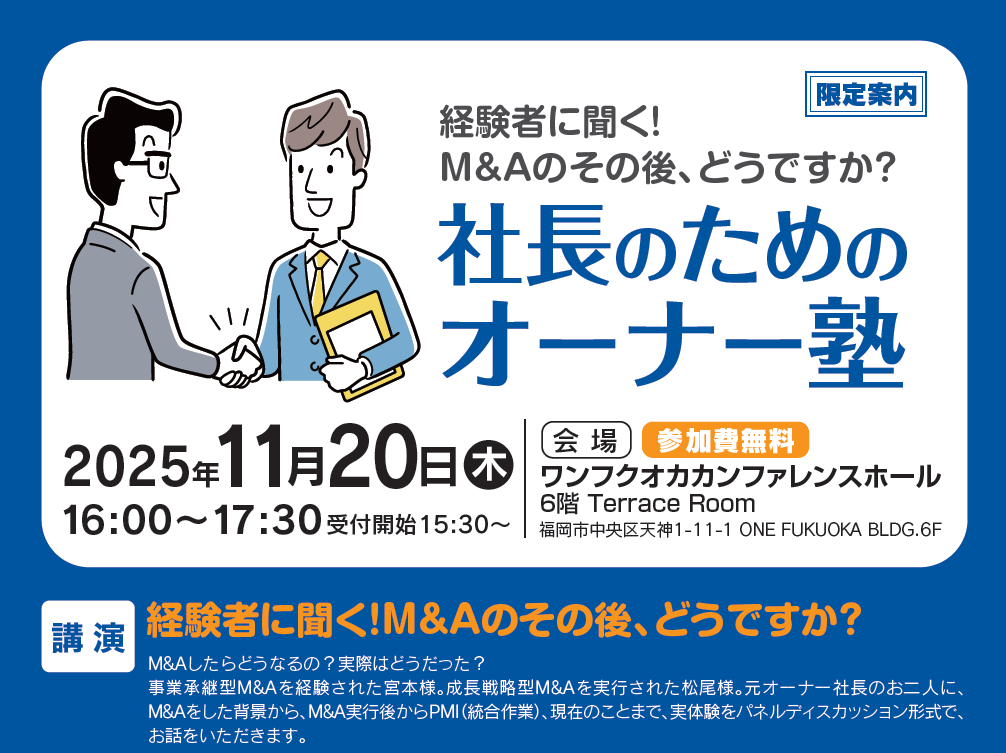 この度弊社では、M&Aを経験された元オーナー社長をお招きし、実体験をもとにご講演いただくセミナー「社長のためのオーナー塾」を下記のとおり開催する運びとなりました。当日は、事業承継型M&A、成長戦略型M&a […]